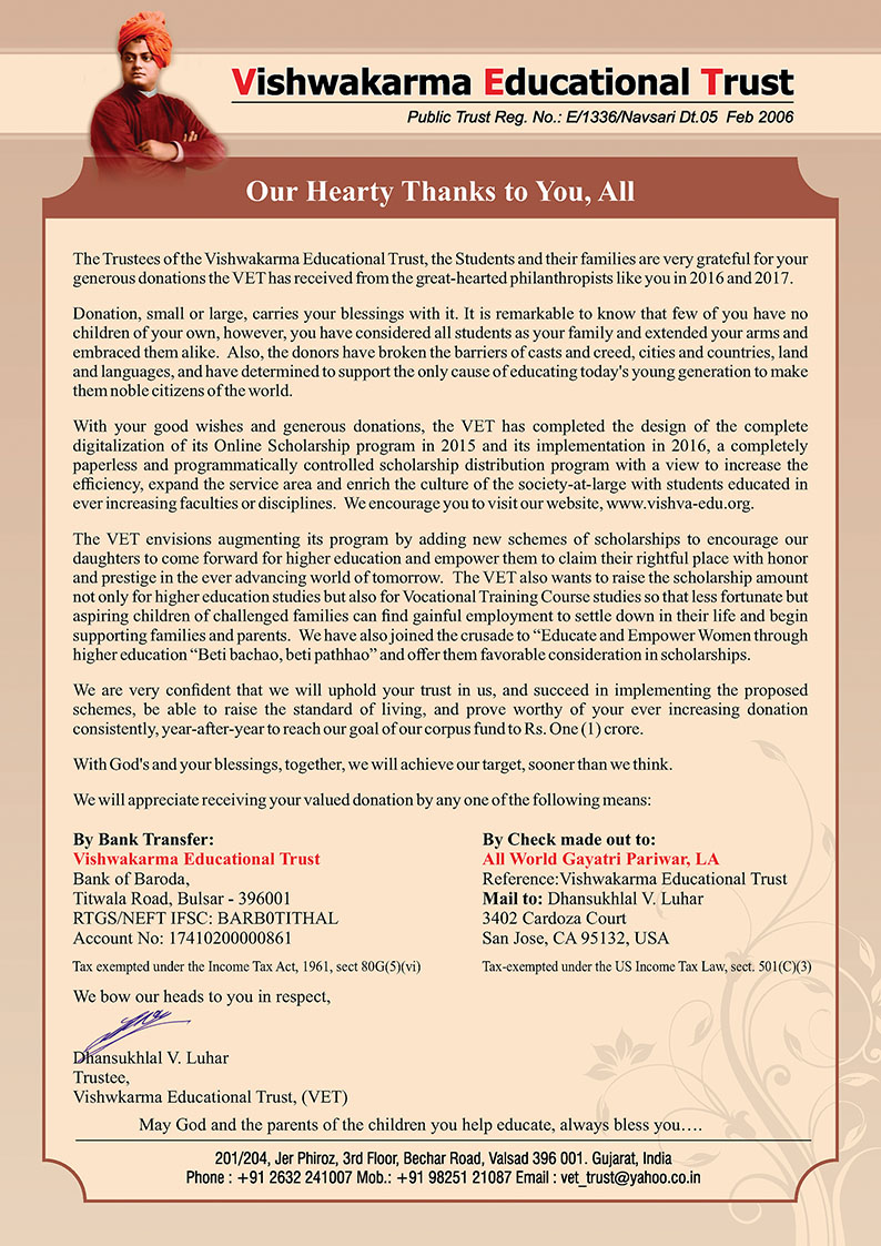 Inability of many parents to send their children to colleges for higher education due to unaffordability of the overall expense, even though their children are brilliant students throughout their high school career, made the children utterly helpless, unhappy, and heartily disappointed, leaving them nowhere to go to get help from. This situation gave birth to the formation of the Vishwakarma Educational Trust.